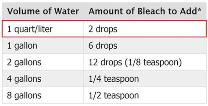 ‘CDC’ instructions for safe drinking water with bleach: Add 1/8 teaspoon (or 8 drops; about 0.625 milliliters) of unscented liquid household chlorine (5–6%) bleach for each gallon of clear water (or 2 drops of bleach for each liter or each quart of clear water).