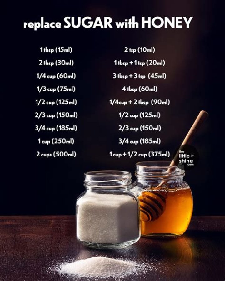 Because honey is sweeter than sugar, the rule of thumb is 3/4 cup honey for every cup of sugar. If the recipe calls for less sugar than one cup, Billy Bee Honey has a handy converter to do the work for you. 4.