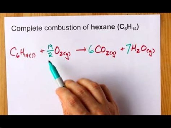 Hexane has the formula C6H14, and in complete combustion (reaction with oxygen) the only products are carbon dioxide and water:C6H14 + xO2 -> yCO2 + zH2Owhere x, y and z are molar ratios.