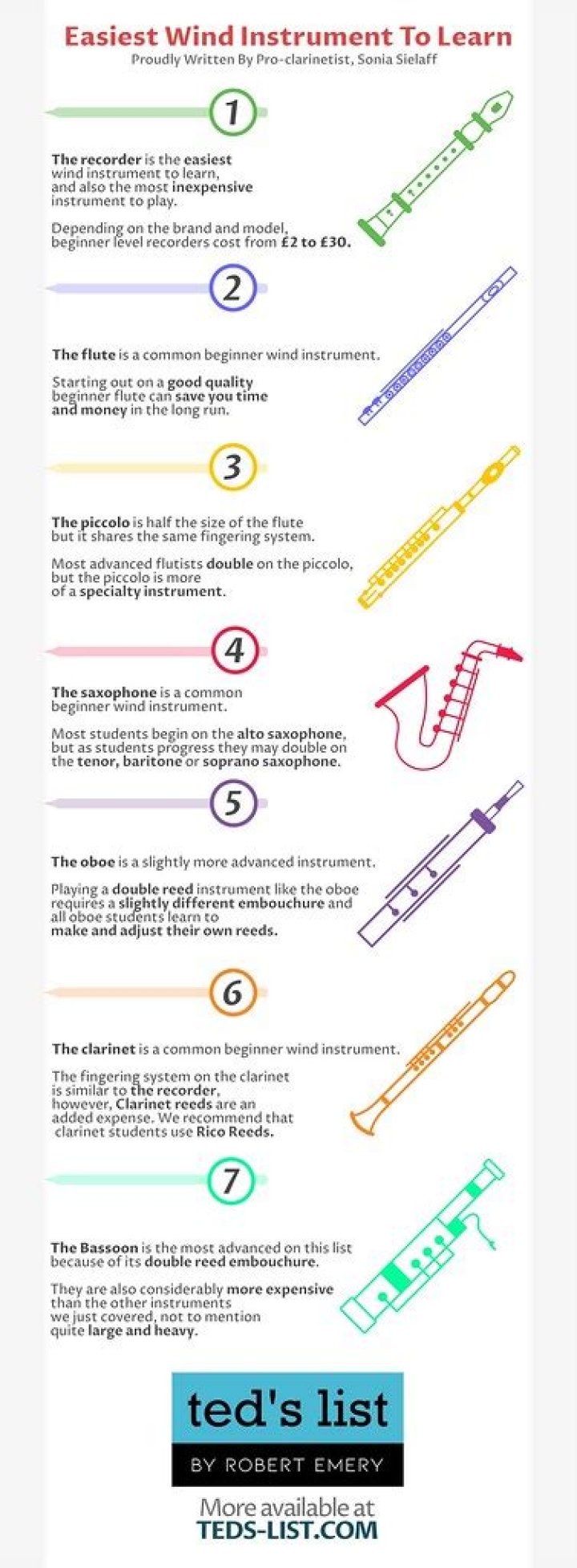 The recorder is probably the cheapest and easiest woodwind instrument to learn. The recorder is a good choice for children under the age of 10. Recorders are light, inexpensive, and easy to make a sound on.